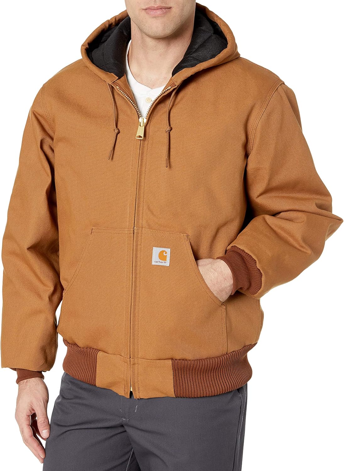 Introducing the Carhartt Men’s Loose Fit Firm Duck Insulated Flannel-Lined Active Jacket – the ultimate blend of rugged durability and cozy comfort for the modern outdoorsman. Crafted from Carhartt’s signature firm duck fabric, this jacket is built to withstand the toughest of conditions while keeping you warm and stylish.