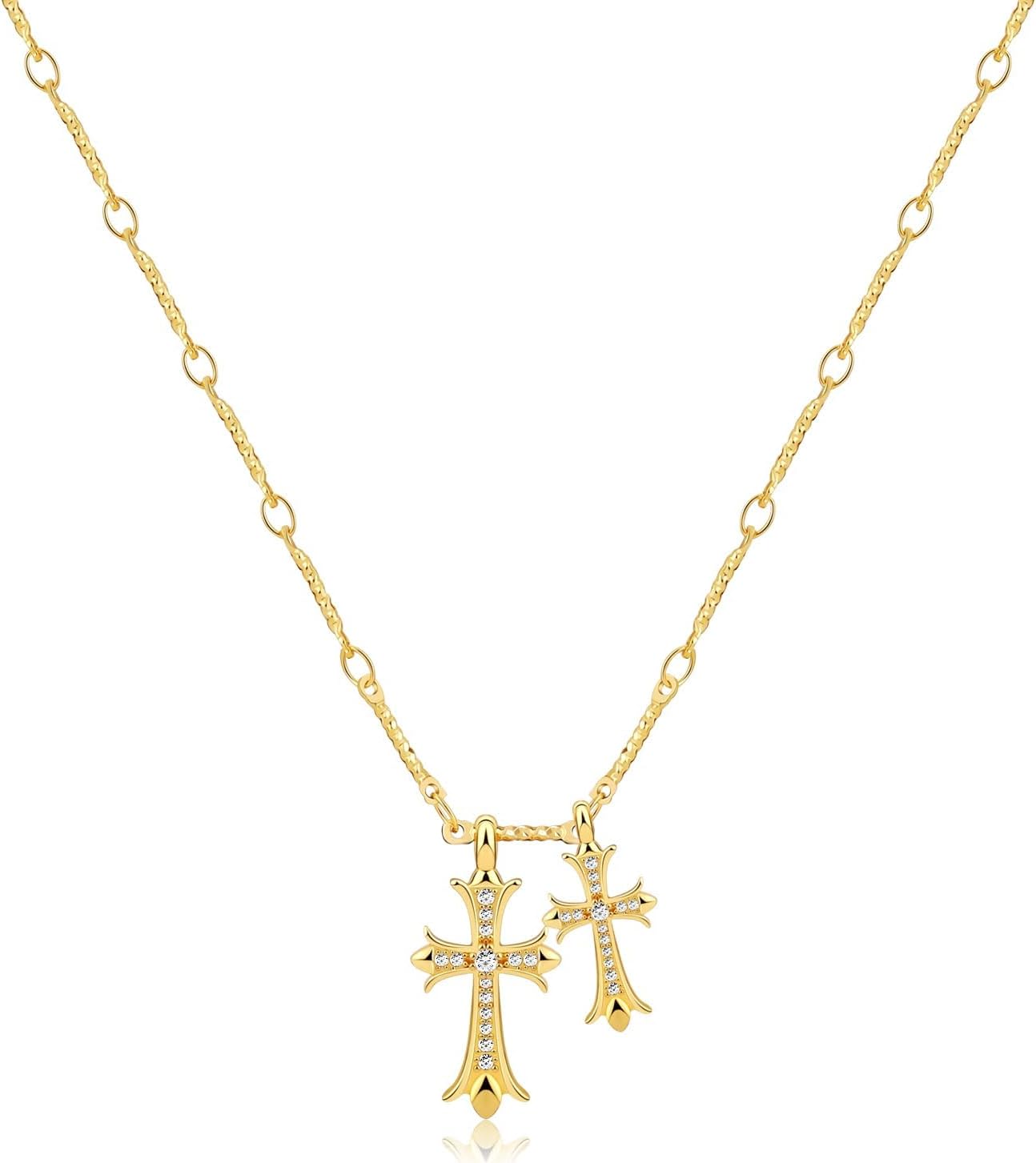 Cross Necklace 14K Gold/Silver Plated Double Cross Pendant Necklace Dainty Diamond Cross Charm Link Chain Choker Delicate Faith Jewelry Religious Gifts for Women